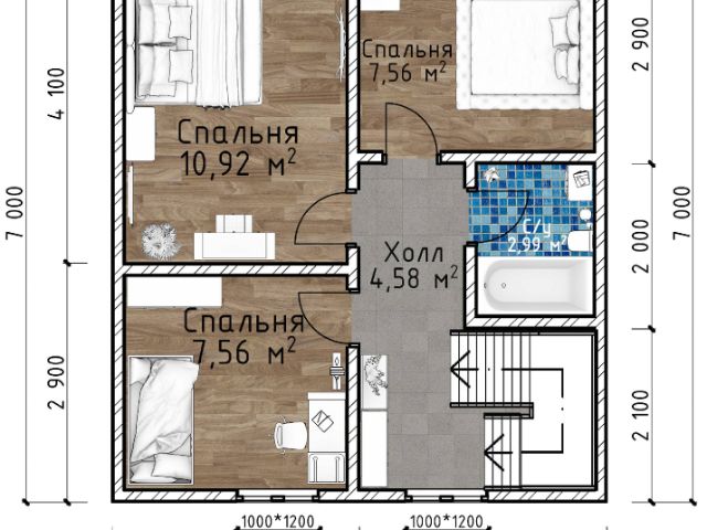 Двухэтажный дом с габаритным размером 10.5х10 м. В этом проекте размещаются четыре спальни, просторная кухня-гостиная с панорамным остеклением, два санузла, две гардеробные, тех.помещение, тамбур, балкон и терраса